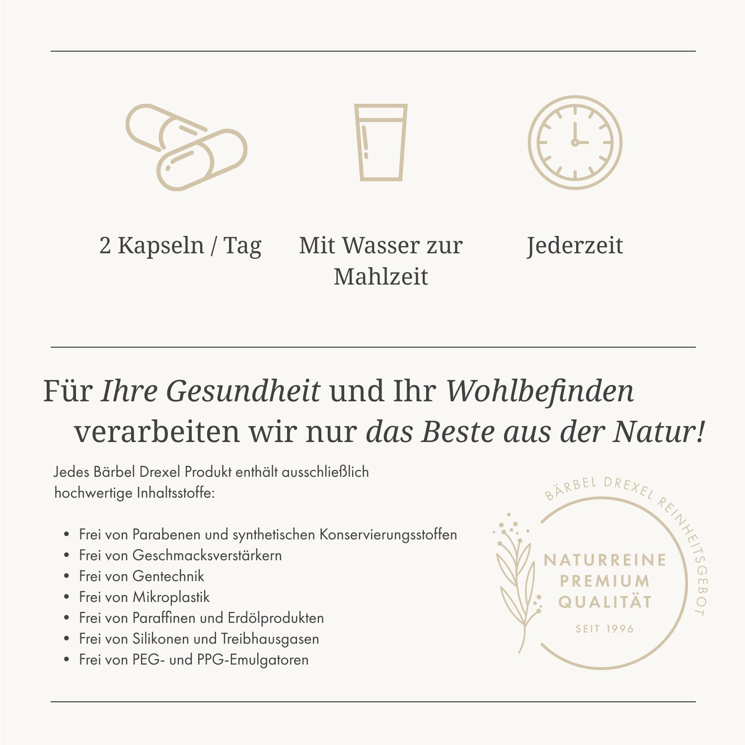 “Seit Jahren unterstütze ich die Produkte von Bärbel Drexel. Die sorgfältige Auswahl an Inhaltsstoffen und die langjährige Erfahrung des wissenschaftlichen Teams, sorgen dafür das die Produkte gut verträglich sind und ihren gewünschten Zweck auch erfüllen.”