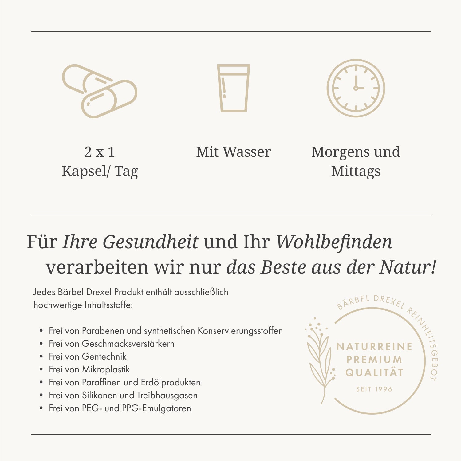 “Seit Jahren unterstütze ich die Produkte von Bärbel Drexel. Die sorgfältige Auswahl an Inhaltsstoffen und die langjährige Erfahrung des wissenschaftlichen Teams, sorgen dafür das die Produkte gut verträglich sind und ihren gewünschten Zweck auch erfüllen.”